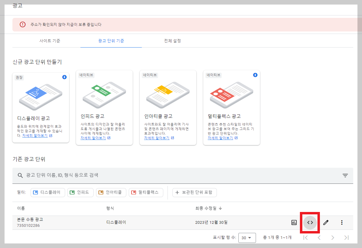 디스플레이 광고코드 생성이 먼저 되어 있어야 한다. 광고 코드를 생성하지 않았다면 아래 포스팅을 참고해서 디스플레이 광고 코드를 생성하면 된다.