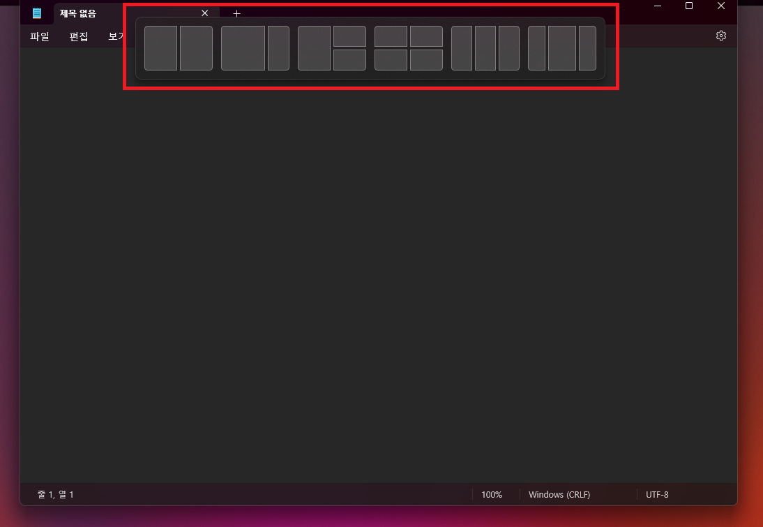 분할하려는 창을 잡은채로 화면 상단의 중앙부로 이동하면 상단에서 분할 화면들이 종류별로 나오게 된다.