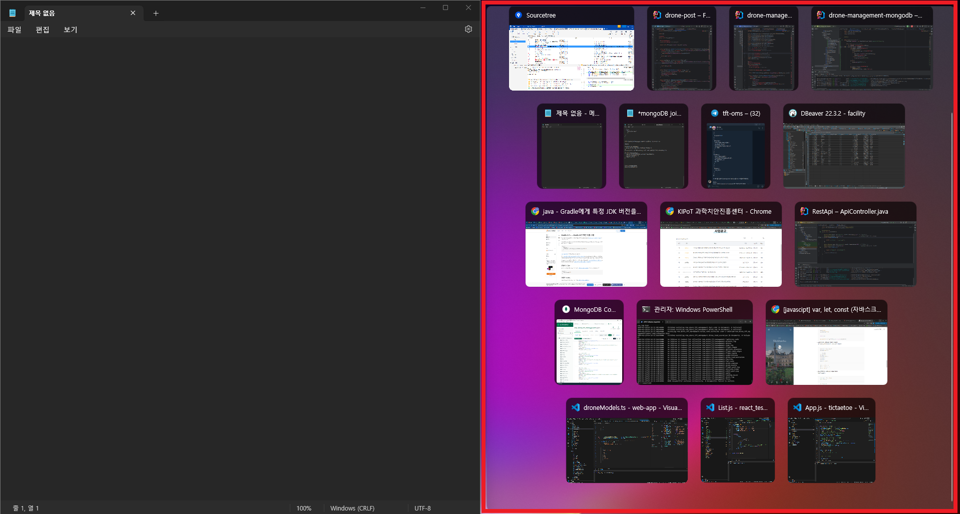 ① [ 윈도우키 + ←, →, ↑, ↓ ]를 사용해 화면 2분할