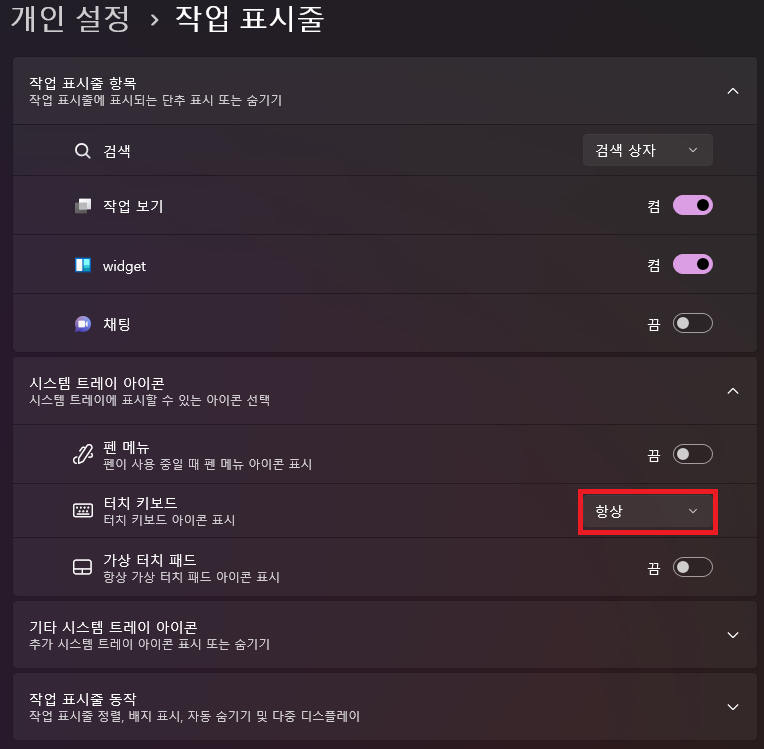 3. 작업표시줄에 "터치키보드" 아이콘을 만들어 사용하기