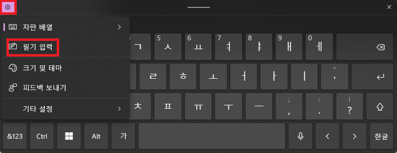 왼쪽상단의 설정버튼을 클릭하고 필기 입력을 클릭하면