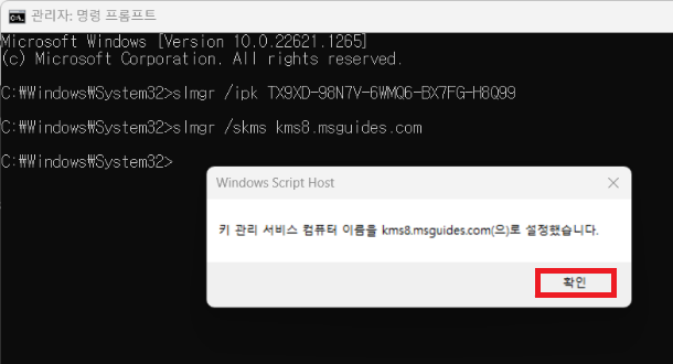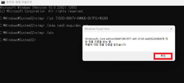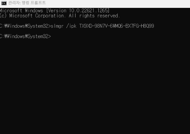3) slmgr /ipk <product key> 를 입력하면 된다.