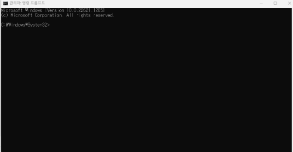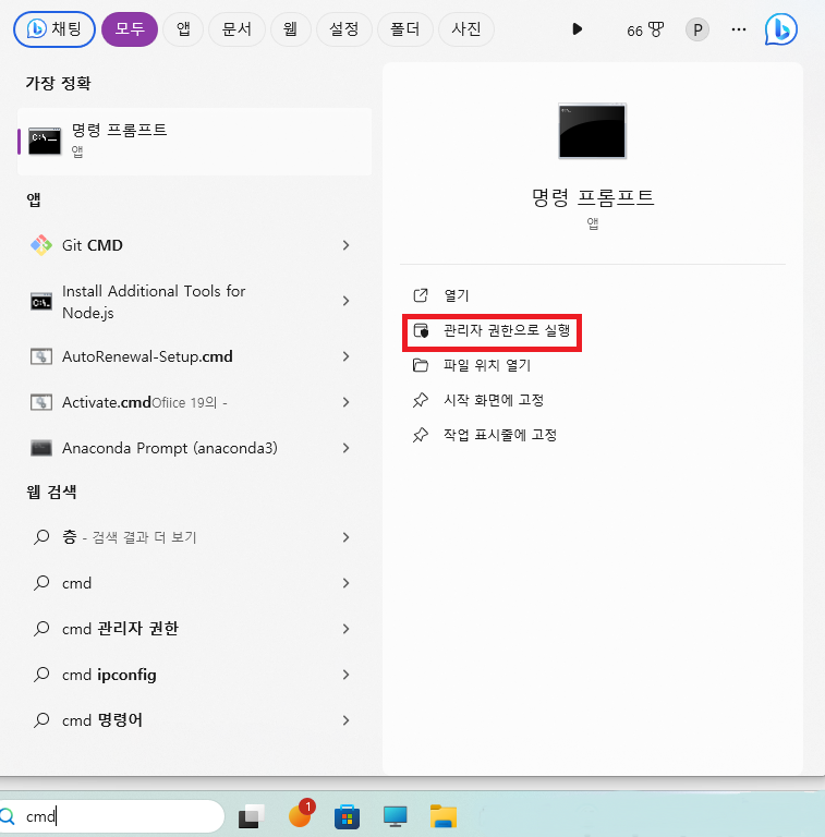 1) 윈도우 검색창에서 CMD를 입력한 후 관리자 권한으로 실행하기를 누른다.