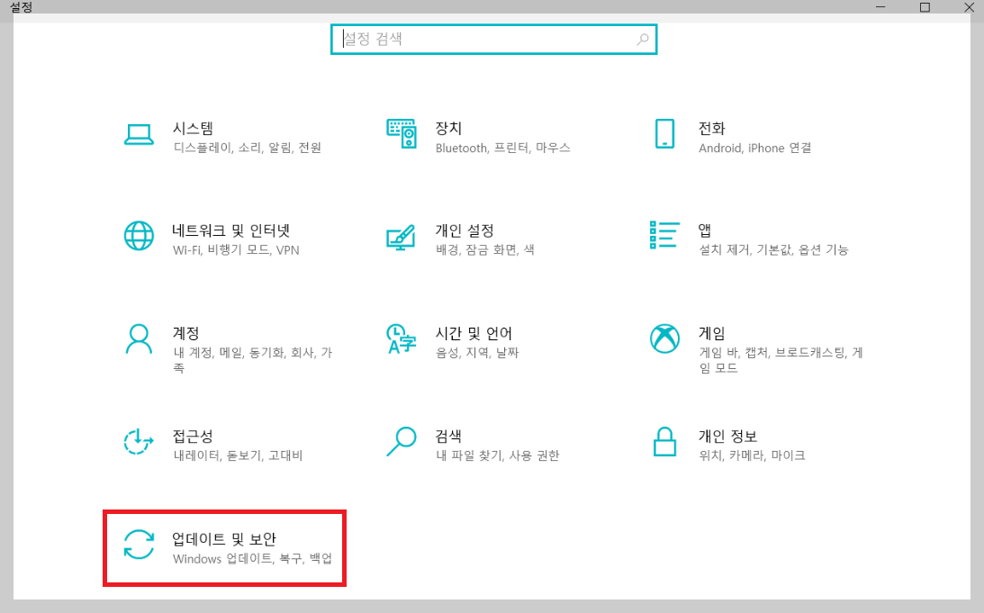 2. 업데이트 및 보안을 클릭한다.
