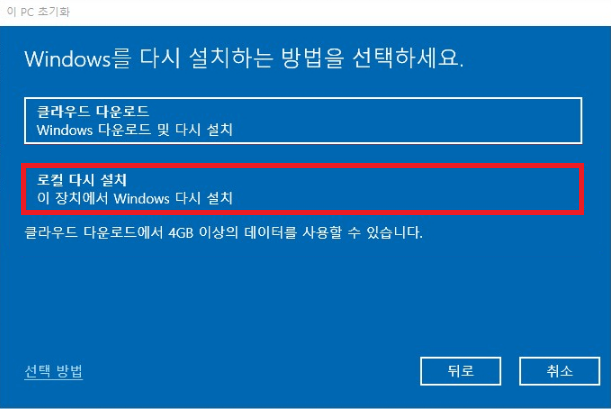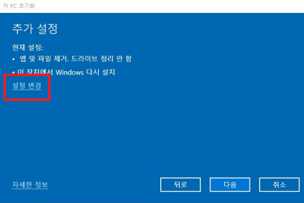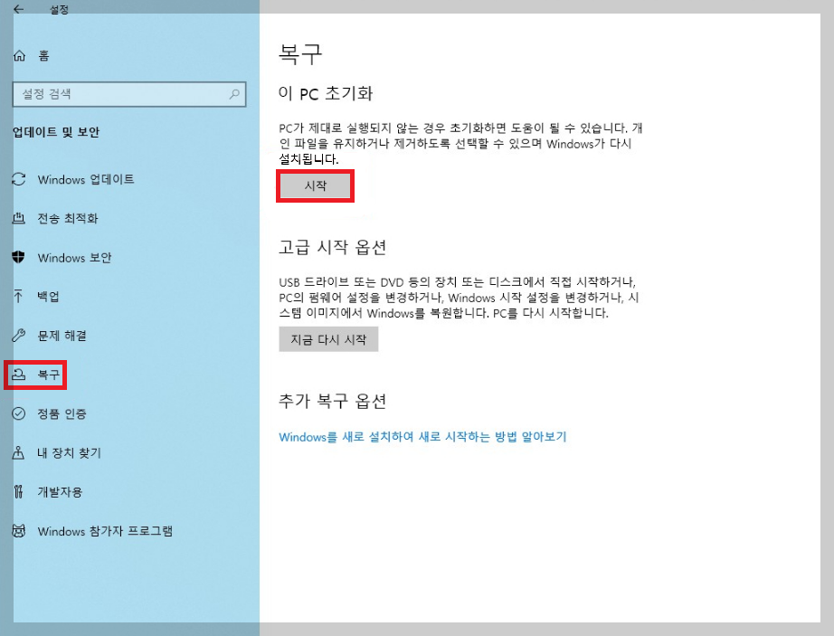 이 PC 초기화의 시작 버튼을 누른다.
