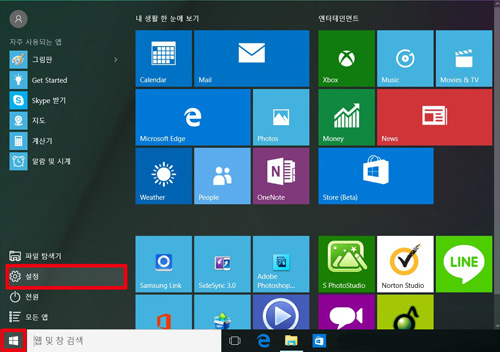 1. 윈도우 키를 누르거나 시작 버튼을 클릭하고 목록에서 설정을 누른다.