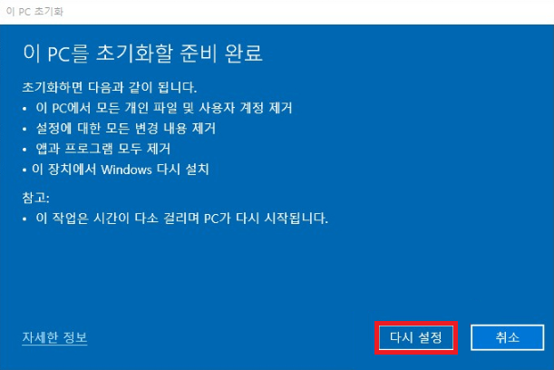 9. 초기화 준비완료라는 창이 나오고 다시 설정을 누르면