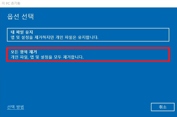 4. 모든 항목 제거를 누른다.(모든 파일들을 삭제하고 윈도우 재설정)