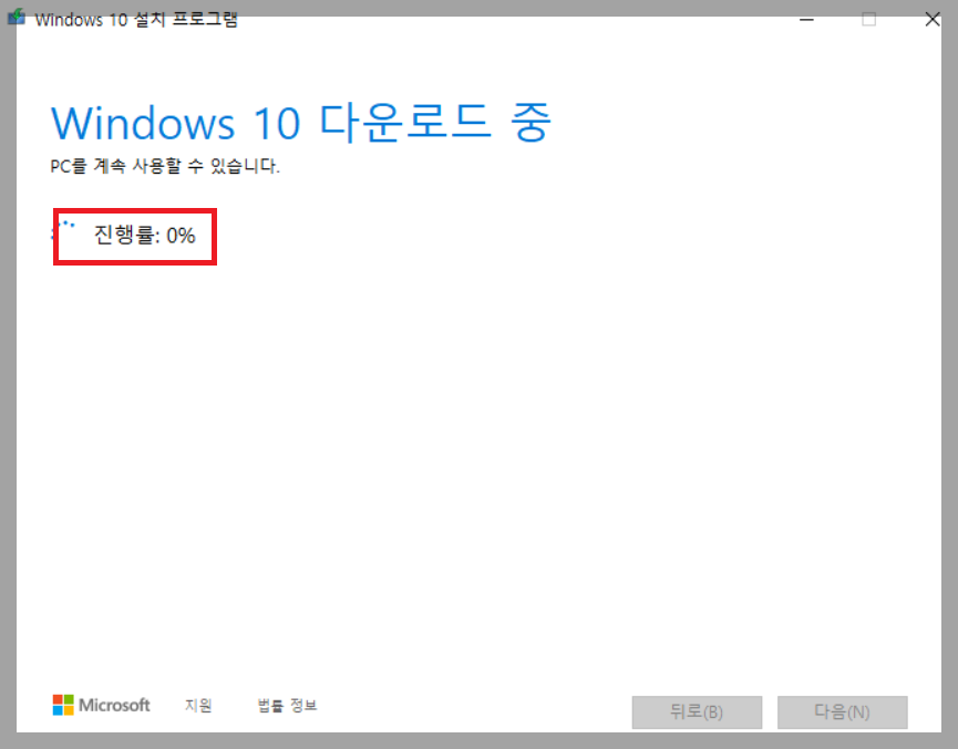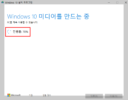 8) 윈도우10 설치 프로그램이 다운로드 된 후 설치 미디어를 만든다. 이때 시간이 10~15분 정도 소요된다.