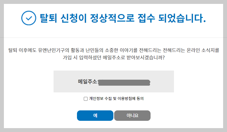 9. 탈퇴 신청이 정상적으로 접수 되었습니다라고 화면이 뜨면 후원 취소 및 탈퇴가 정상적으로 된것이다. 소식을 메일로 받아보려면 예를 누르고 계속 전화나 이메일로 연락오는게 싫다면 아니오를 눌러준다.
