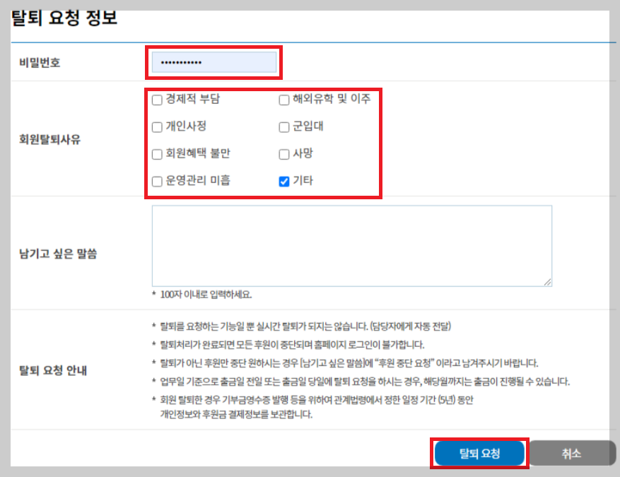 8. 비밀번호와 회원탈퇴사유를 한가지 체크하고 남기고 싶은 말씀은 간단하게 쓰고 탈퇴요청을 누른다.