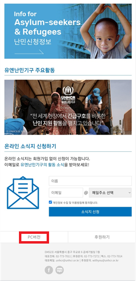 위 링크로 접속한 다음 유엔난민기구 홈페이지에서 아래로 스크롤을 하여 맨아래쪽의 PC버전을 클릭한다.