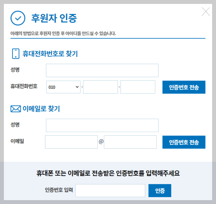 3. 자신이 등록했던 휴대전화 또는 이메일 둘중 하나로 찾기를 누르고 인증 번호를 전송한 다음 맨아래에 인증번호를 입력한다. (필자는 휴대전화로 인증)
