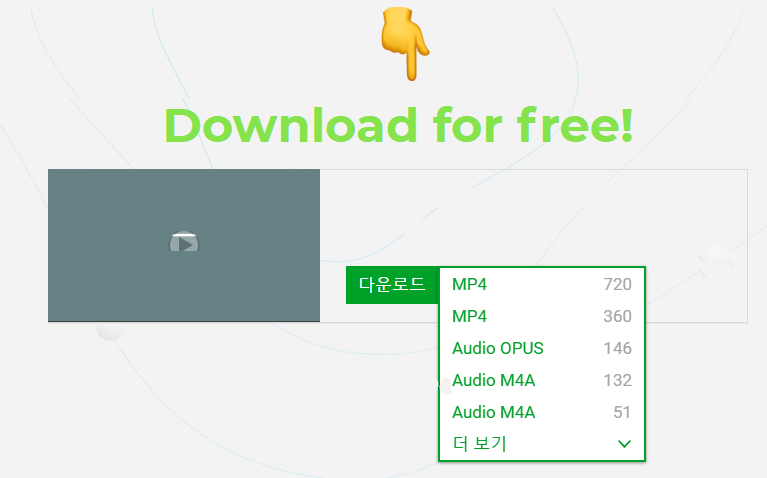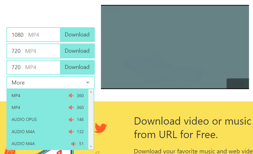 사용 방법: 위의 사이트와 마찬가지로 링크 입력란에 영상의 링크를 입력하고 다운로드를 누르고 다운로드할 비디오 파일이나 오디오 파일의 형식을 선택한 후 다운로드를 누르면 된다.