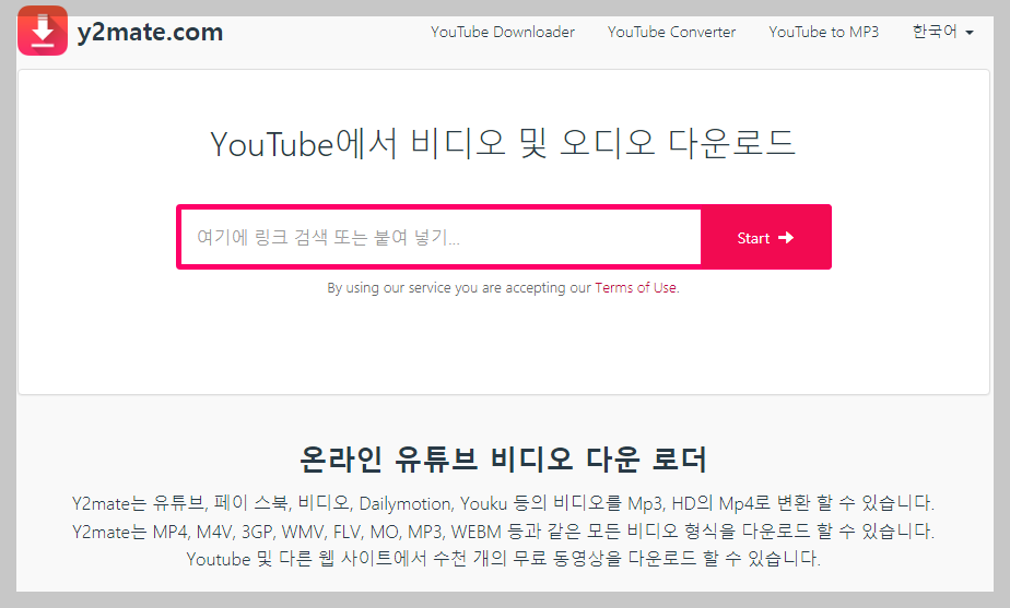 사용 방법1: 링크 입력란에 영상의 링크를 입력하고 Start를 누르면 다운로드할 비디오 파일이나 오디오 파일의 형식을 선택한 후 다운로드를 누르면 된다.