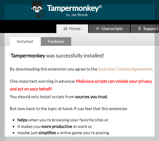 3. 잠시후 설치가 잘됐다 되면 Tampermonkey was successfully installed!라고 뜬다.