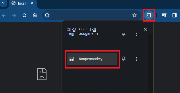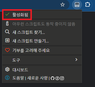 그래도 버튼이 생기지 않는다면 상단의 확장프로그램 버튼을 누르고 Tampermonkey를 누르고 활성화됨으로 되어있는지 확인후 F5를 눌러 새로고침 하거나 창을 모두 끄고 다시 실행해본다.