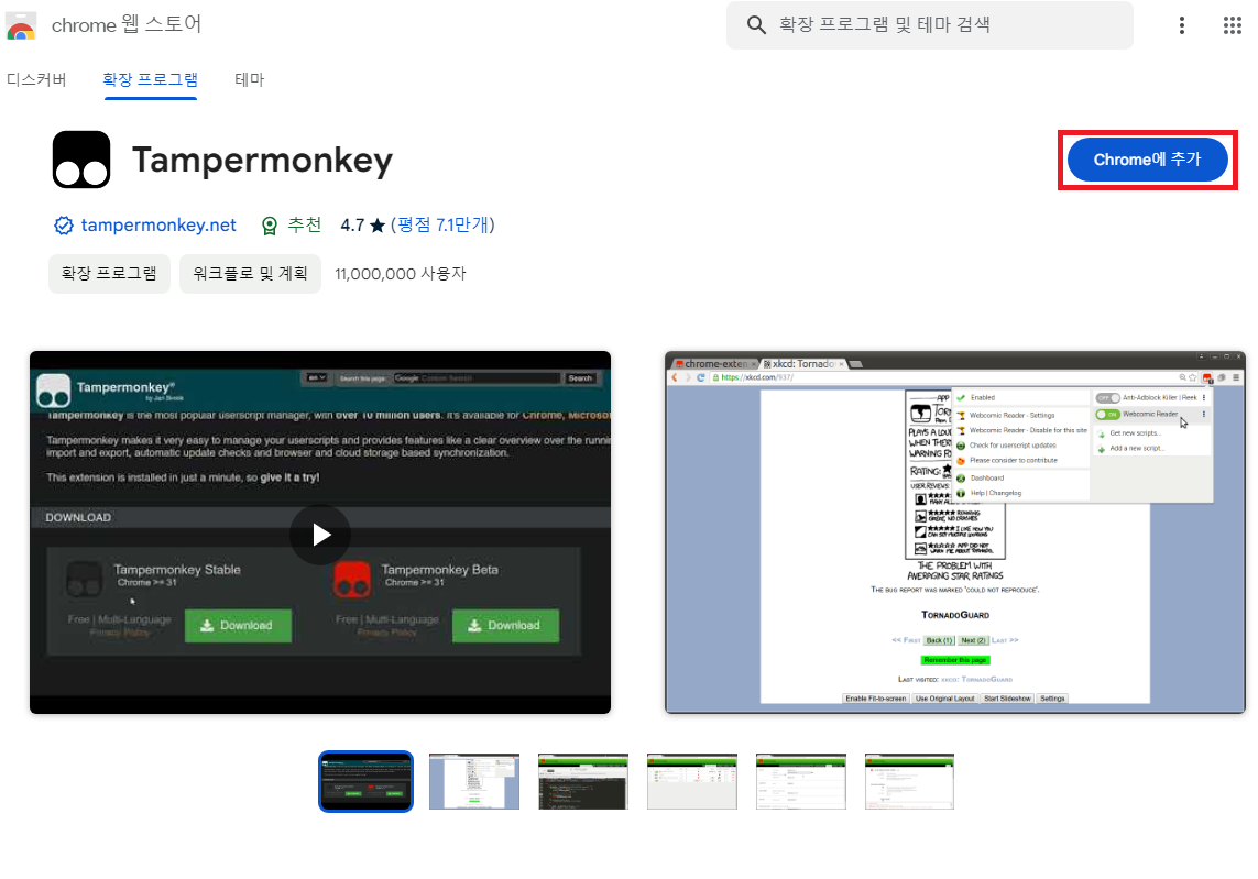 1. 아래 링크를 통해 [크롬 웹스토어 - Tamper monkey] 확장팩 링크로 접속한다.