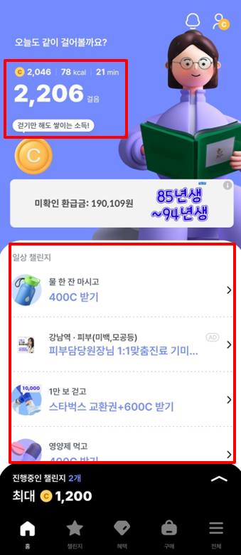 코인은 챌린지 뿐만 아니라 걸을때마다 코인이 적립되기