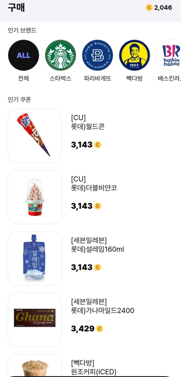 커피, 아이스크림, 빵, 편의점 물품등 다양하게 교환을 하여