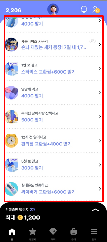 걸음수 아래에 보면 일상챌린지 목록들을 볼 수있는데