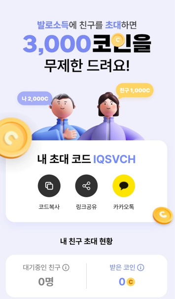 친구를 발로소득에 초대하면 3,000코인을 받을 수 있고
