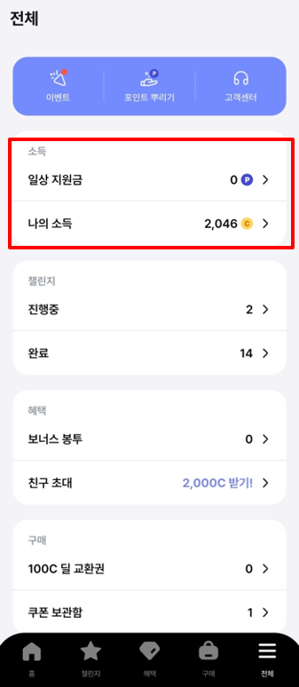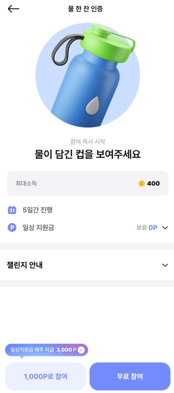 이 챌린지들은 일주일에 3000P씩 지급되는 일상지원금