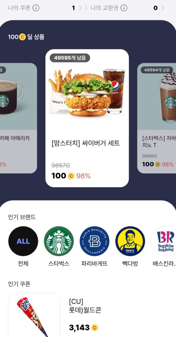 커피, 아이스크림, 빵, 편의점 물품등 다양하게 교환을 하여
