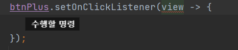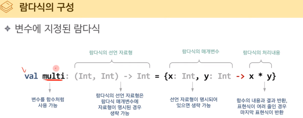 - 람다식의 할당 : {매개변수1, 2, ... -> 반환식}