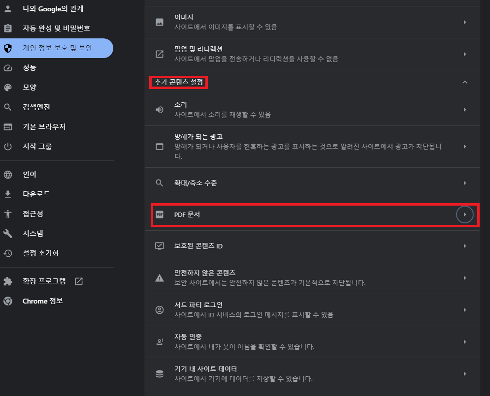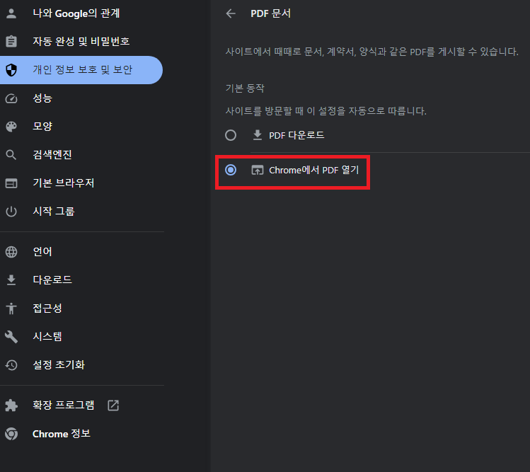 1. 크롬의 설정을 잘못 설정한 경우로 pdf 파일이 열리지 않는 경우