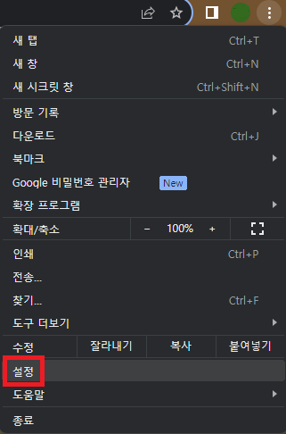 1) 크롬 브라우저의 오른쪽 상단의 점 3개를 클릭하고
