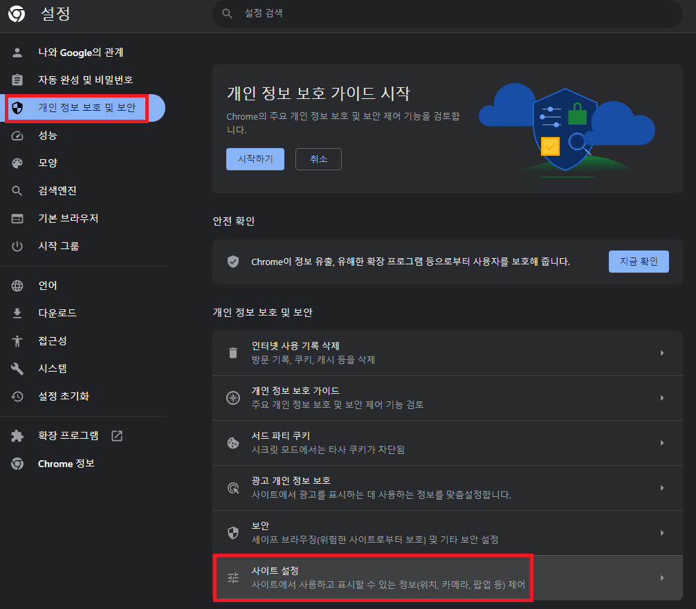 오른쪽 하단에 사이트 설정을 클릭한다.