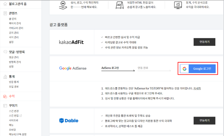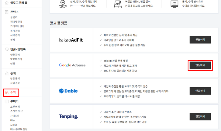 광고 플랫폼에서 구글 애드센스의 연동하기를 클릭한다.