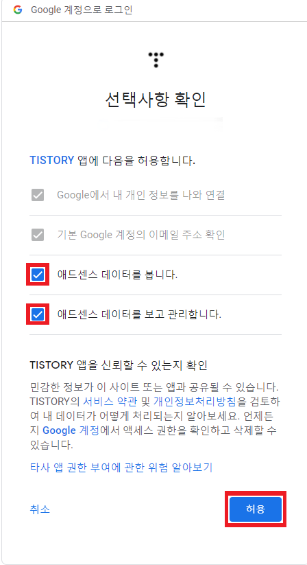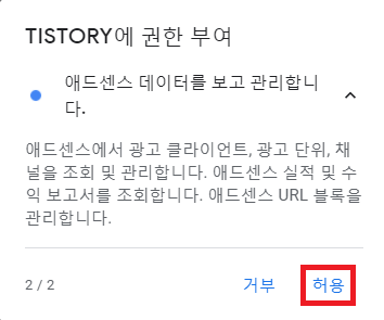 3) 로그인을 하면 Tistory 권한 부여창이 나오는데 둘다 허용을 누른다.