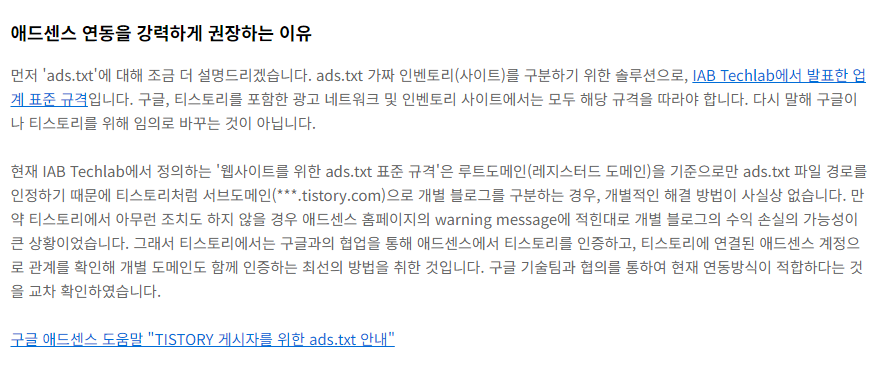 안녕하세요. 티스토리 팀입니다. 지난 '사전 안내'에서 말씀 드린 대로 "ads.txt 파일 문제 해결을 위해서는 수익 메뉴에서 애드센스 계정을 연동해야 하고, 연동하지 않을 경우 광고가 미노출" 될