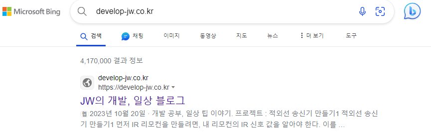 Bing 검색창에 블로그 주소를 입력하면 내 블로그명과 소개가 나오는 것을 확인 할수 있다.