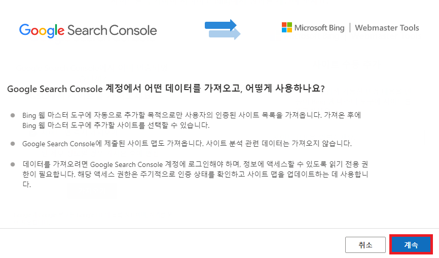 5. 구글 서치 콘솔에 등록된 사이트 중 Bing에 등록할 사이트를 선택한 다음