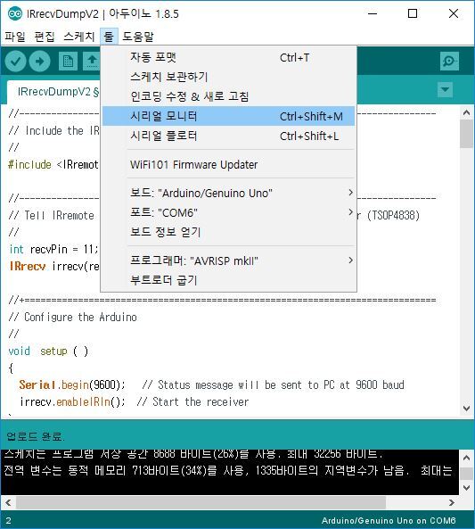 IRremote의 예제 중 IRErecvDumpV2를 선택해준다.