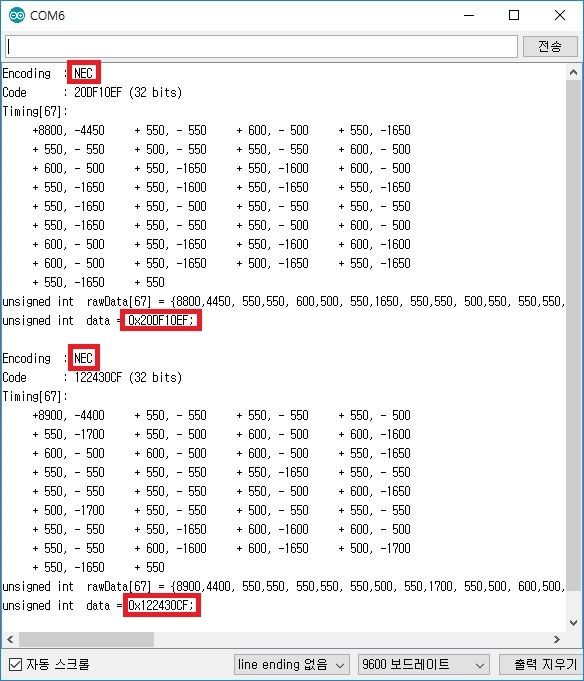 리모컨의 IR 신호가 NEC 포맷으로 인코딩 되어있고, TV 전원 버튼의 값은 0x200DF10EF, 셋탑 전원 버튼의 값은 0x122430CF인 것을 알 수 있다.
