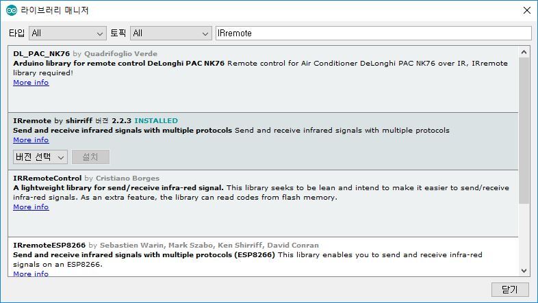 라이브러리 매니저에서 IRremote 검색 후 설치해준다.
