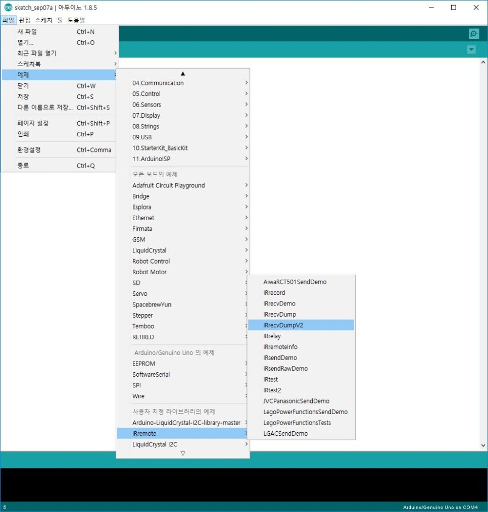 IRremote 라이브러리를 설치해주면 예제가 생성된다.