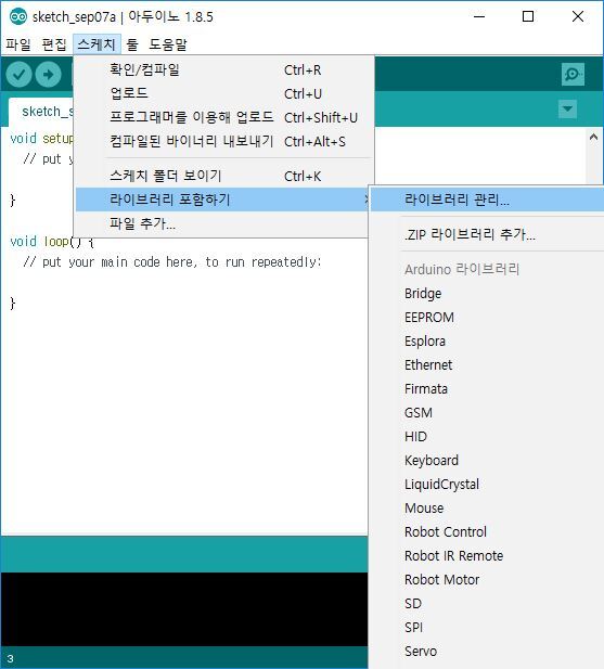스케치 - 라이브러리 포함하기 - 라이브러리 관리 선택