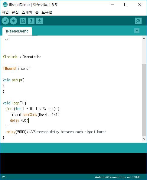 코드가 irsend.sendSony(0xa90,12); 밖에 없으니 이 코드가 ir 값을 보내는 명령이라는 것은 직관적으로 알 수 있을 것이다.