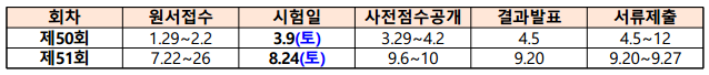 올해 50회와 51회 필기와 실기없이 단일 시험으로 진행되며 일년에 2번 시행된다.