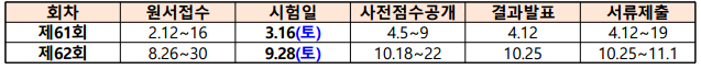 올해 61회와 62회 필기와 실기없이 단일 시험으로 진행되며 일년에 2번 시행된다.