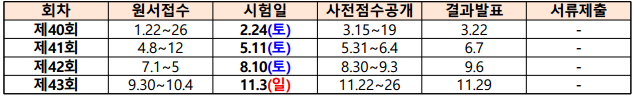 올해 40~43회 필기와 실기없이 단일 시험으로 진행되며 일년에 4번 시행된다.