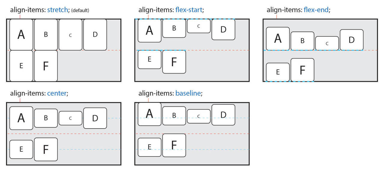 따라서 align-items를 사용하려면 align-content 속성을 기본값(stretch)으로 설정해야 합니다.