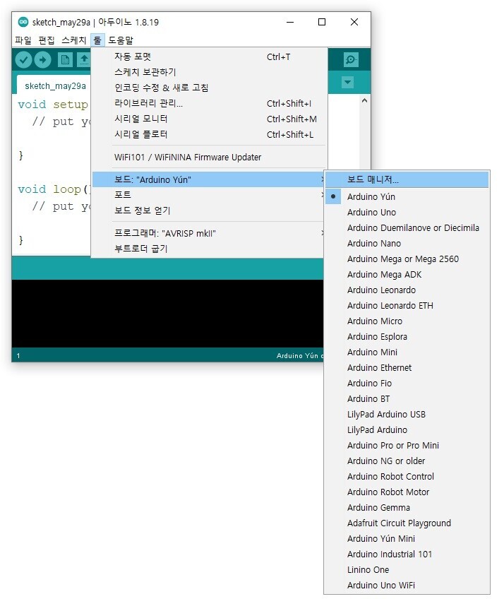 툴 -> 보드-> 보드 매니저 를 선택한다.