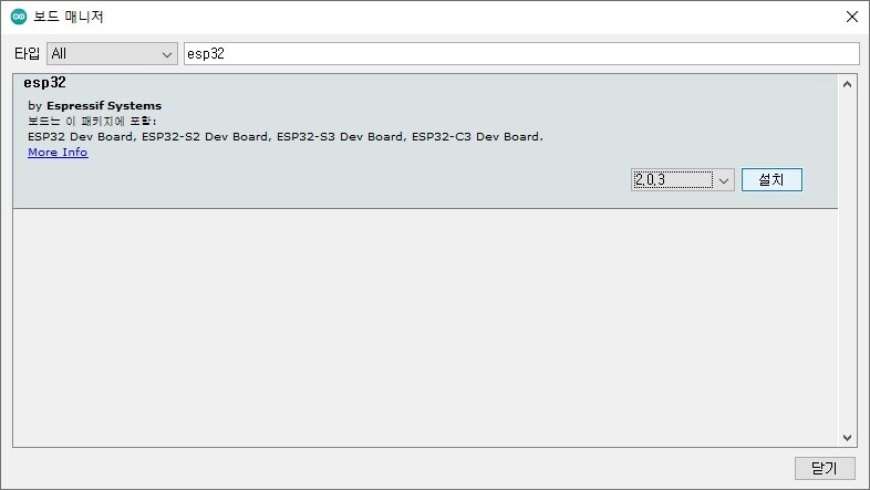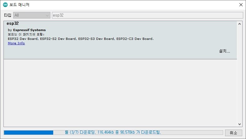 "esp32" 를 입력하면 위와 같이 패키지 설치 화면이 나오는데