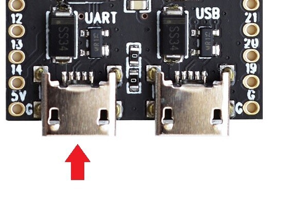 빨간색 화살표 USB 포트를 사용하여 PC와 연결하면 UART0를 이용하여 버튼 조작없이 자동으로 업로드 된다